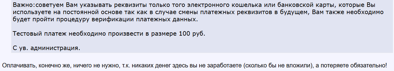 Чтобы придать пустышке убедительности, Андрея заботливо сообщает – важно указывать свои реквизиты, которые используются на постоянной основе. Есть и предупреждения о верификации платежных данных.