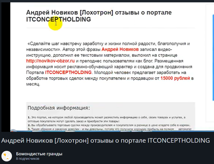 Согласно методичке аферистов, с одностраничника доносились привлекательные убеждения и обещания. Андрей Новиков представил своим клиентам еще и видео инструкцию по заработку, презентуя ее в качестве блога. Автор продвигал портал ITCONCEPTHOLDING. Основной оффер финансового наставника – заработок на посредничестве между продавцами и покупателями и пассивный доход от 15000 в месяц.