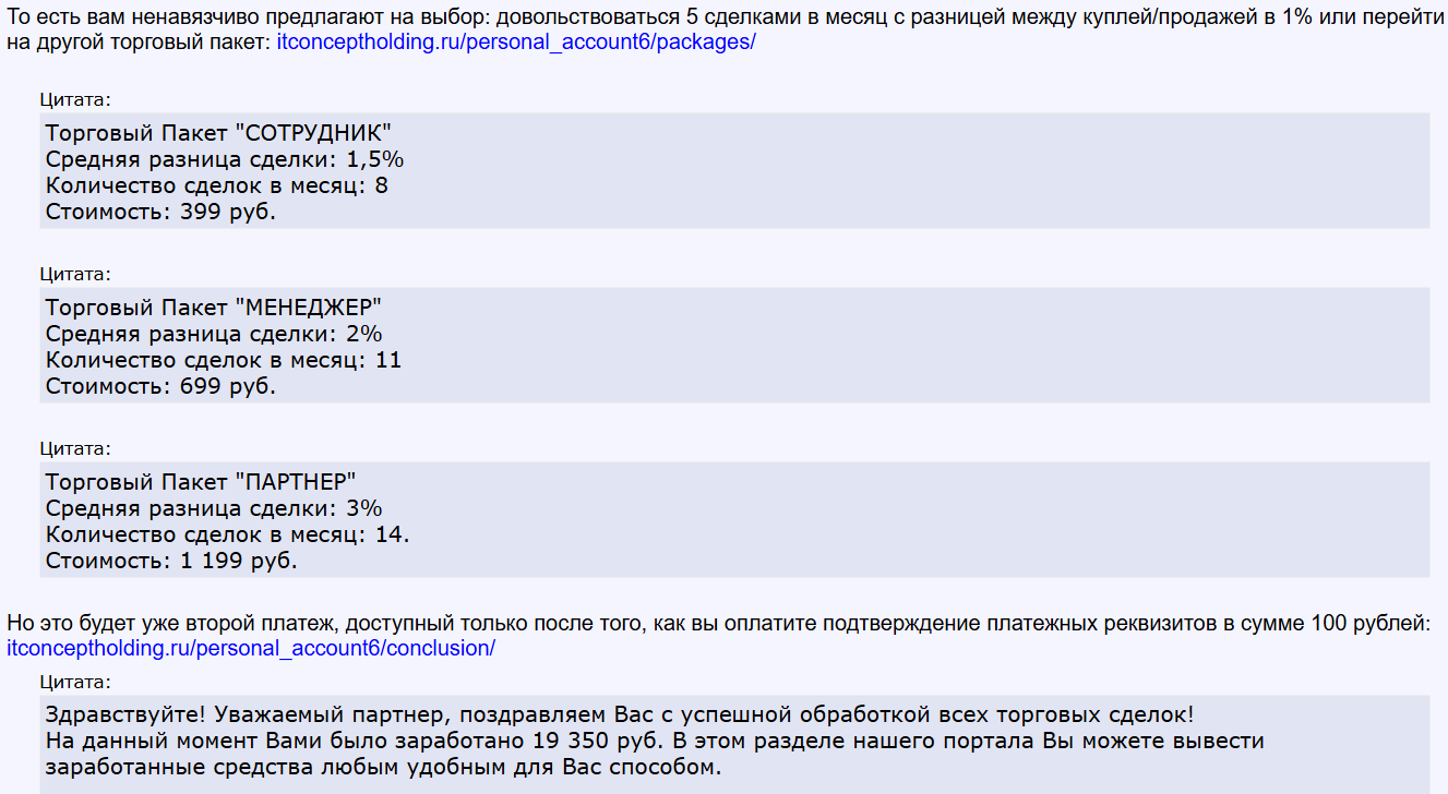 На одном из форумов находим детальную схему обмана. Каждый раз пользователю обещали пять сделок, совершив которые он заработает почти 20 тыс. руб. Аппетит у работника, конечно, разыграется и он захочет продолжить сотрудничество с проектом. Но новые сделки якобы доступны в торговом пакете следующего месяца.
