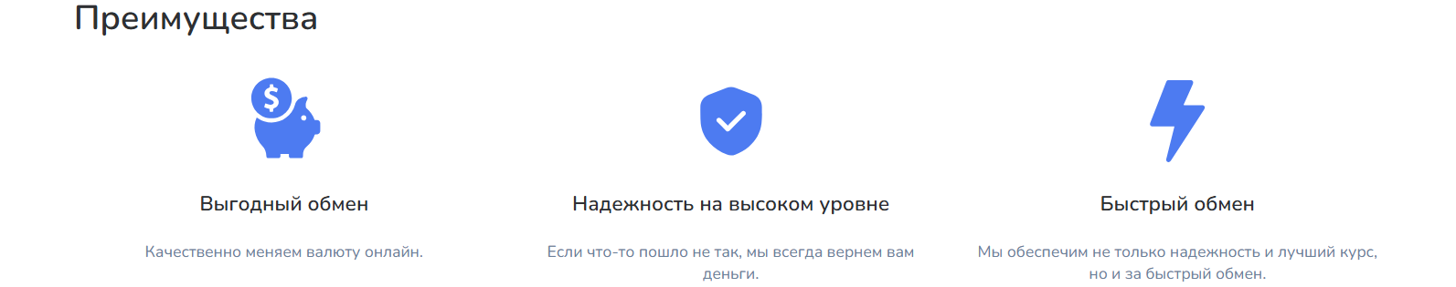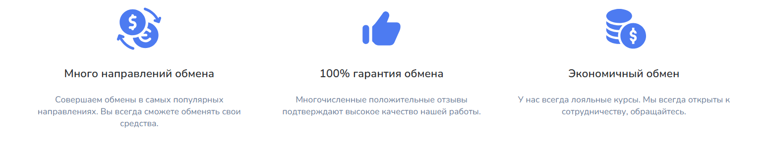 Кроме обещанных 100% гарантий и экономии на лояльных курсах пишут, что на сайте есть множество направлений для обмена валют. Заявляют о наличии множеств положительных отзывов о работе с платформой.