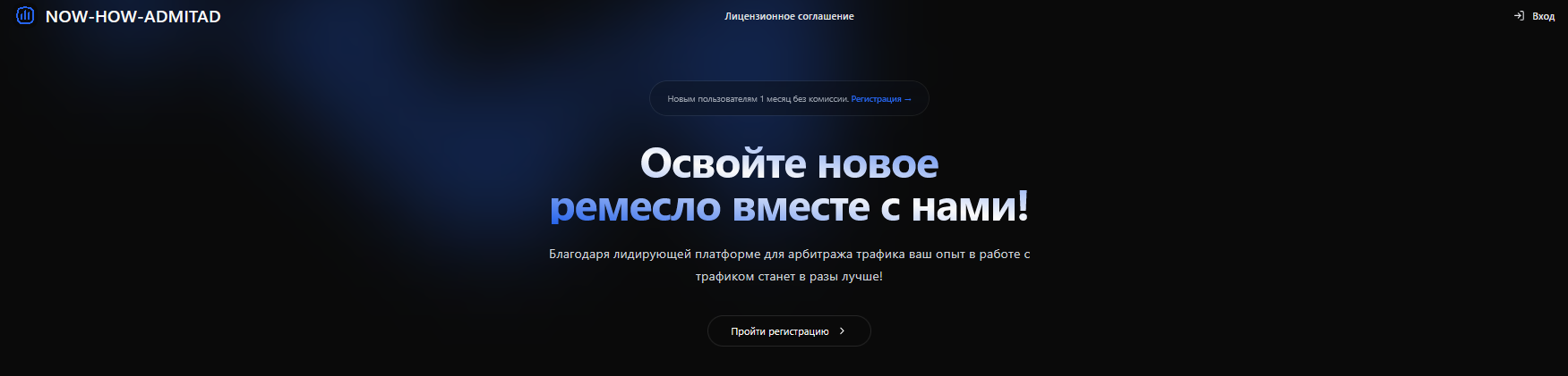 Сайт Https Now how admitad pro встречает потенциального клиента практически пустой страницей. Никакой презентации нет, чем именно занимается компания, неизвестно. Сведения о брокере отсутствуют, наименование и владельцы сервиса не указаны. Есть только призывы начать «Осваивать новое ремесло» и регистрироваться на сайте. Новым клиентам обещают бесплатное обслуживание в первый месяц работы на платформе.