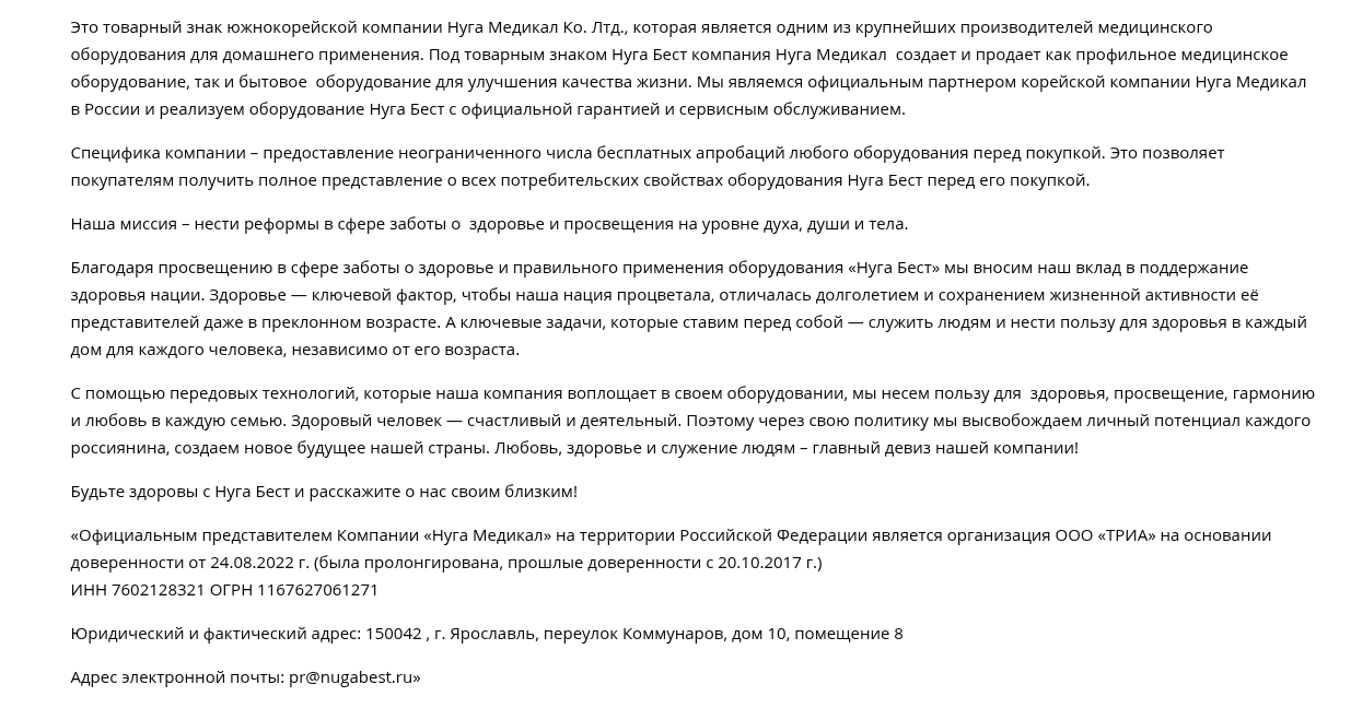 Если взглянуть на юридическую сторону вопроса, то здесь все оформлено достаточно грамотно. Официальный представитель корейской Nuga Best в РФ – ООО «ТРИА» (ИНН 7602128321) с пропиской в Ярославле. Контора работает на российском рынке с 2004 года и хвастается тем, что открыла уже больше 300 залов в 250 городах. Да, на первый взгляд, это вполне легальный бизнес с кучей наград вроде «Бренд года», но серьезных минусов здесь тоже хватает.