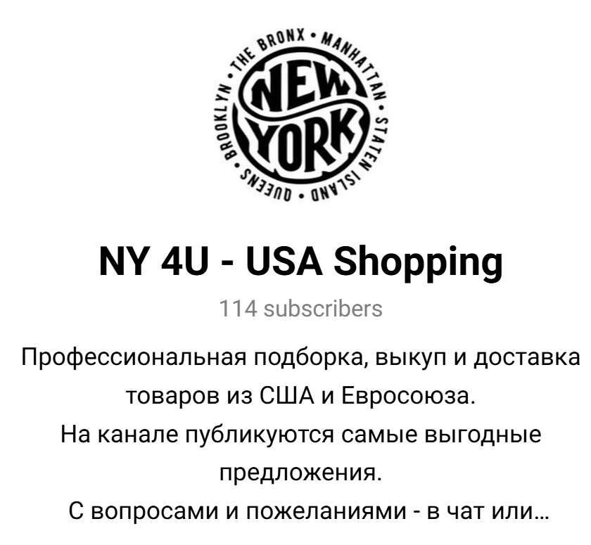 Канал Ny 4u Usa Shopping запущен 16 мая 2024-го. Клиентам предлагают подключиться к закрытому клубу и регулярно получать интересные предложения с площадок Нью-Йорка. Для общения и обсуждения товаров предлагается писать в чат, который на начало декабря 2025-го уже не доступен.