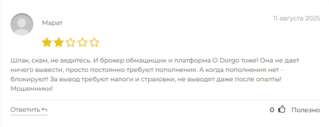 Отзывов на O dorgo me не так много, но все они негативные. Трейдеры категорически убеждают пользователей не торговать с данным брокером и рассказывают, что он ворует деньги.