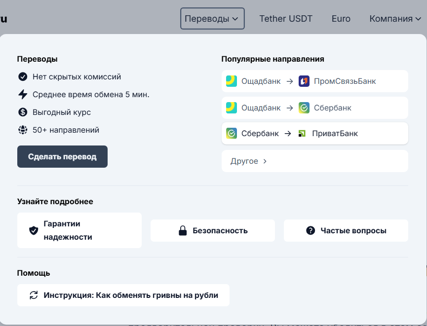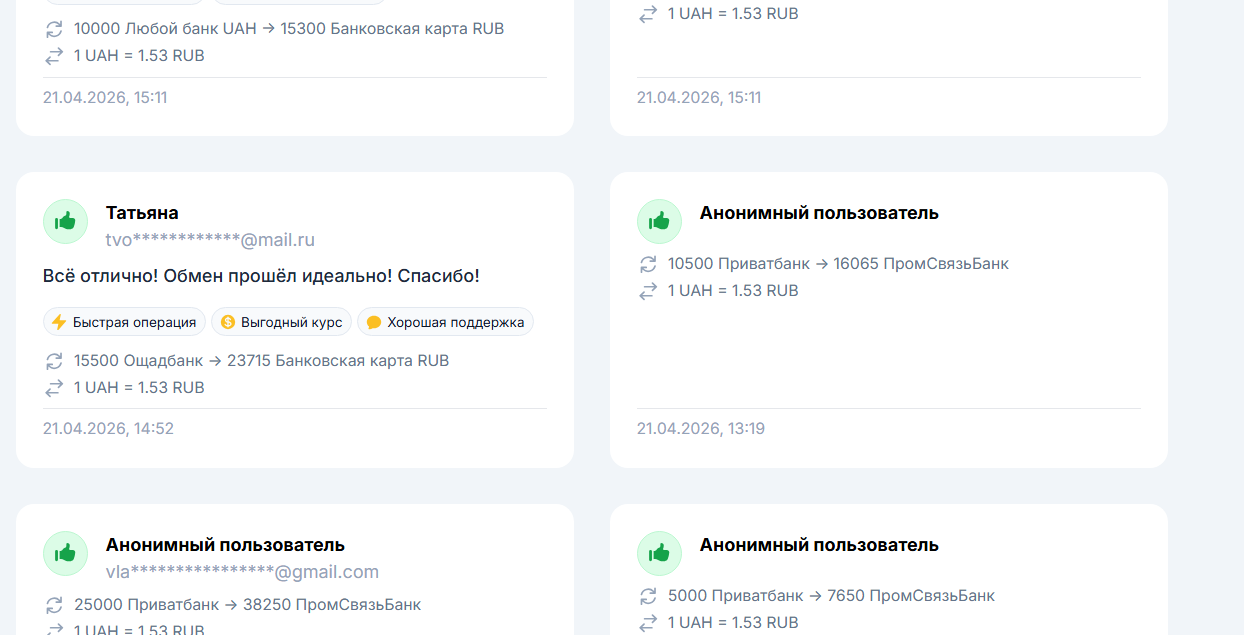 Платформа предлагает клиентам широкий спектр услуг по обмену фиатных денег, популярных электронных валют и ликвидных стейблкоинов. Поддерживаются востребованные международные платежные системы: Payoneer, AdvCash, Qiwi, ЮМани, PayPal, Zen, Revolut, Wise, Payeer. Возможны прямые переводы на банковские карты Европы (Германия, Франция, Польша) и стран СНГ. Заявки обрабатываются операторами исключительно вручную в рабочее время с 7:00 до 23:00 по московскому времени.
