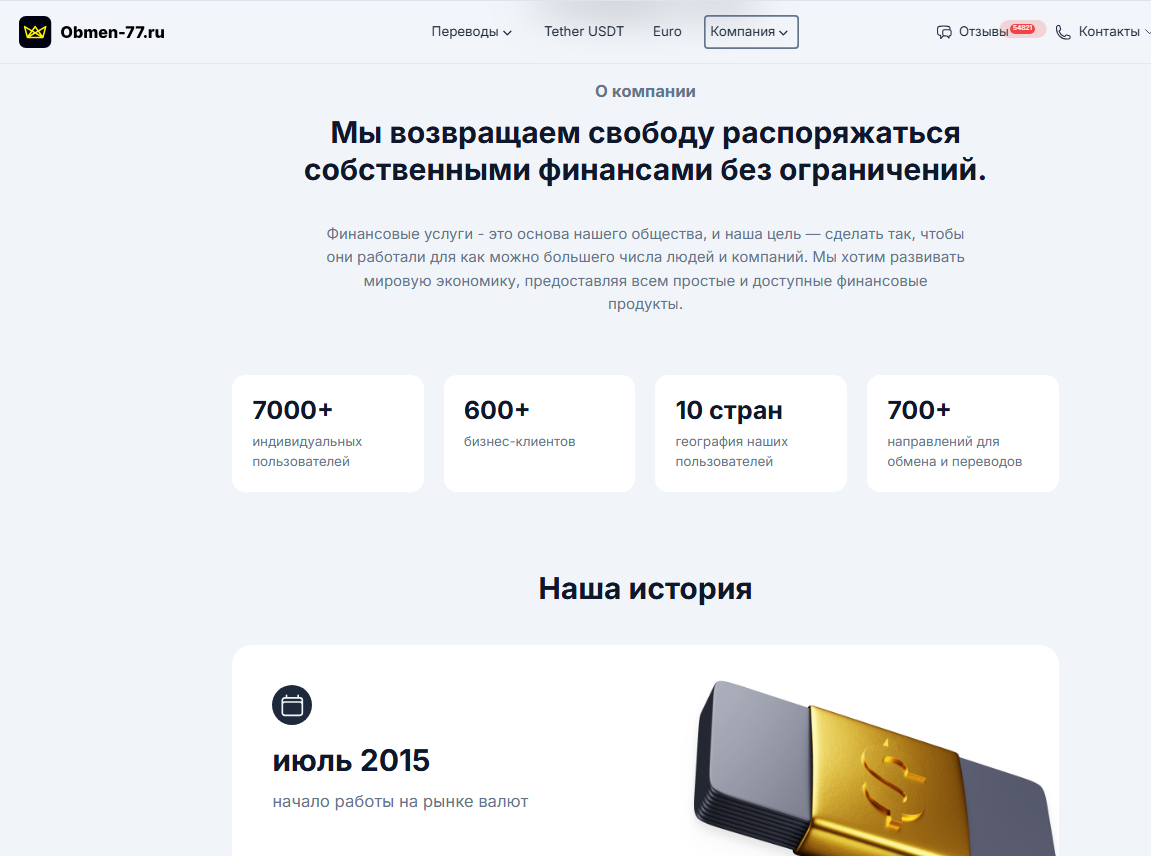 Сервис работает через два домена одновременно: Obmen 77 Ru и Obmen 77 Com. На страницах официального сайта в доменной зоне Ru сказано, что проект непрерывно функционирует с 2015 года. Утверждается, что за это десятилетие компания успела обслужить свыше 7 тысяч довольных клиентов. В 2021 году фирма якобы расширила свое физическое присутствие и открыла официальное представительство в Москве на улице Сухонская, д. 11А, кв. 89, а также дополнительный офис в Донецке (ДНР) по адресу проспект Мира, 17, помещение 64.