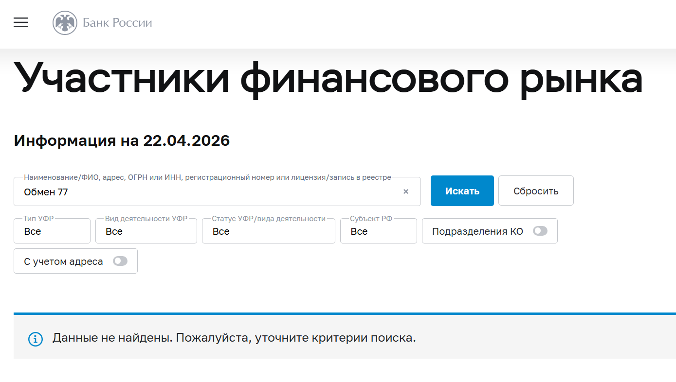 На авторитетных профильных мониторингах вроде BestChange финансовый сервис Обмен 77 Ру полностью отсутствует, что для обменника с таким солидным стажем выглядит крайне нетипично.