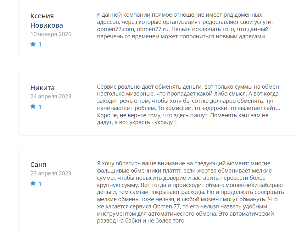 На независимых ресурсах, которые собирают анализы различных инструментов финансового рынка, рейтинг Обмена 77 крайне низкий. Отзывы в интернете — в основном отрицательные. Пользователи массово отмечают зависшие на часы, а иногда и на долгие дни заявки, которые техническая поддержка совершенно не спешит обрабатывать.
