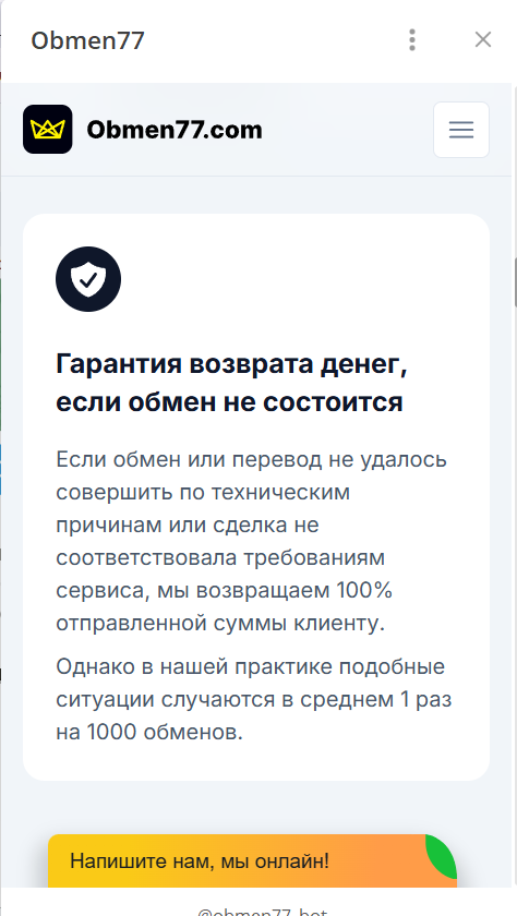 Хотя напрямую данный сервис в отчетах не назван, сама механика работы через ботов без соответствующей лицензии создает серьезные риски для отправителей. Никаких юридических гарантий того, что ваши отправленные активы благополучно дойдут до конечного адресата, площадка Obmen 77 не предоставляет — в ТГ-приложении и на сайте есть только обещания.