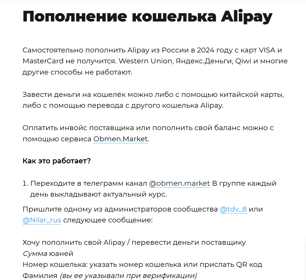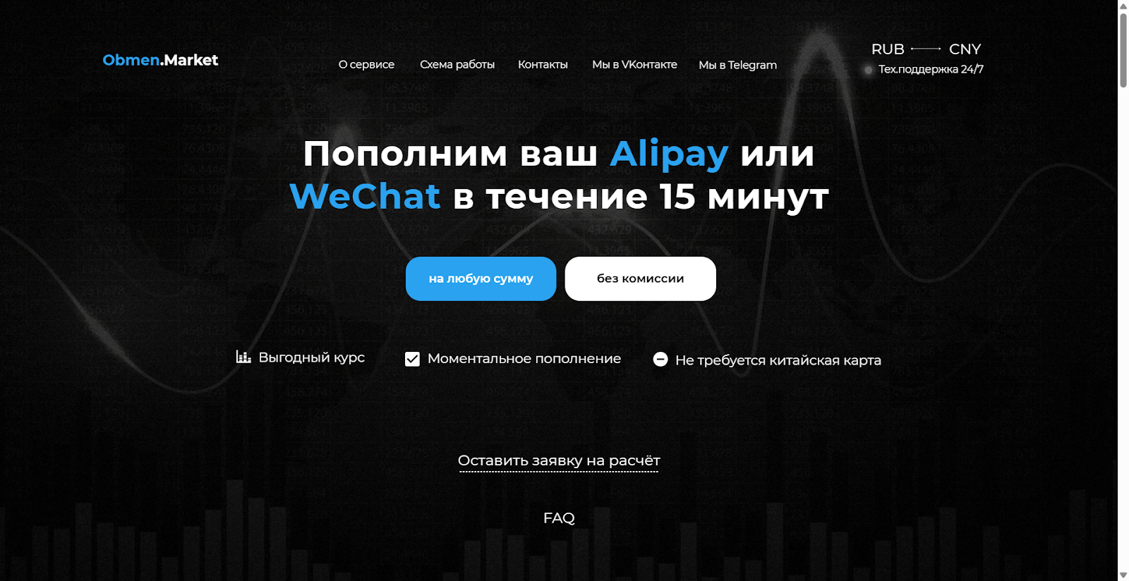 Obmen market дает возможность пополнять Alipay и WeChat, менять рубли на юани. Оплата услуг для удобства доступна не только в российской валюте, но и в долларах, и в евро. Даже есть возможность обменивать наличные, но только в 2 городах – Нижнем Новгороде и Москве. Официальный сайт организации представляет собой одностраничник с краткой информацией и ссылками с подробные инструкции.