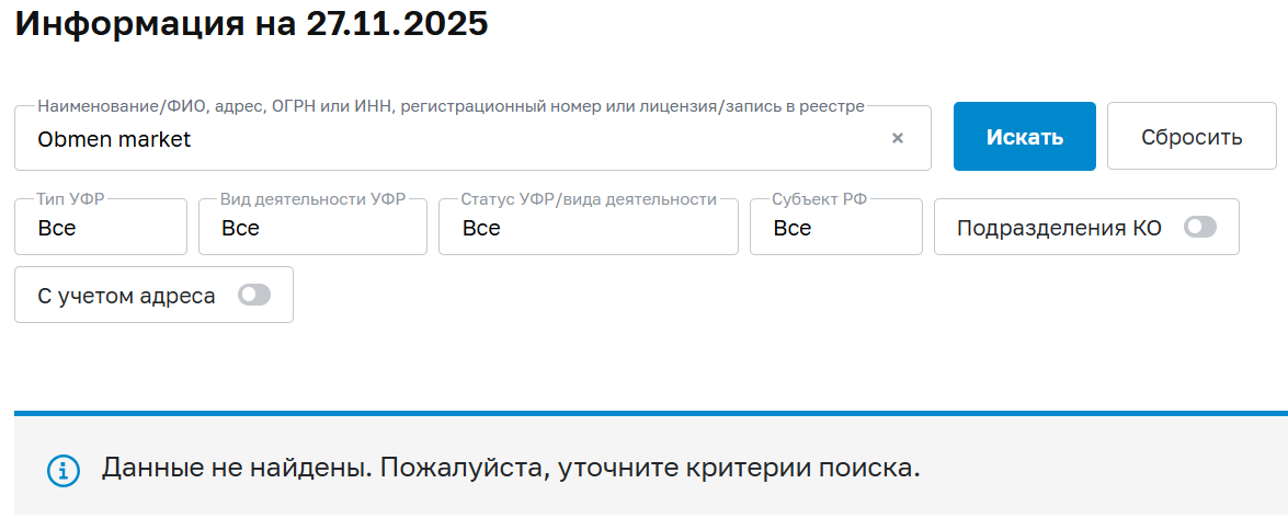 Возможно, Obmen market – не скам, но на территории он действует вне закона. Разрешения от Центрального Банка России у предприятия нет.