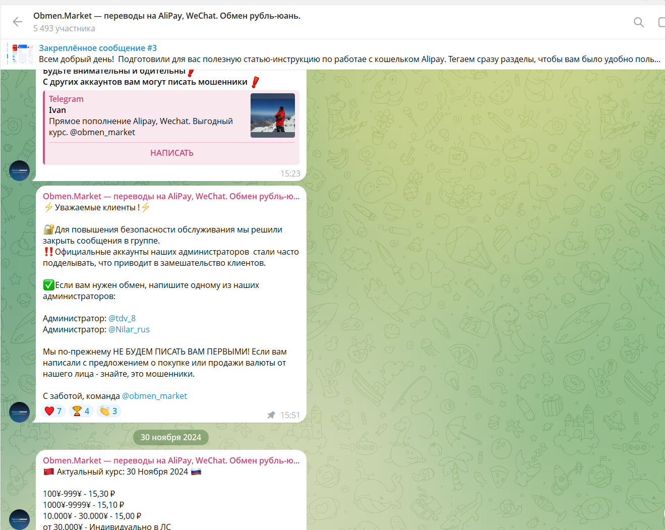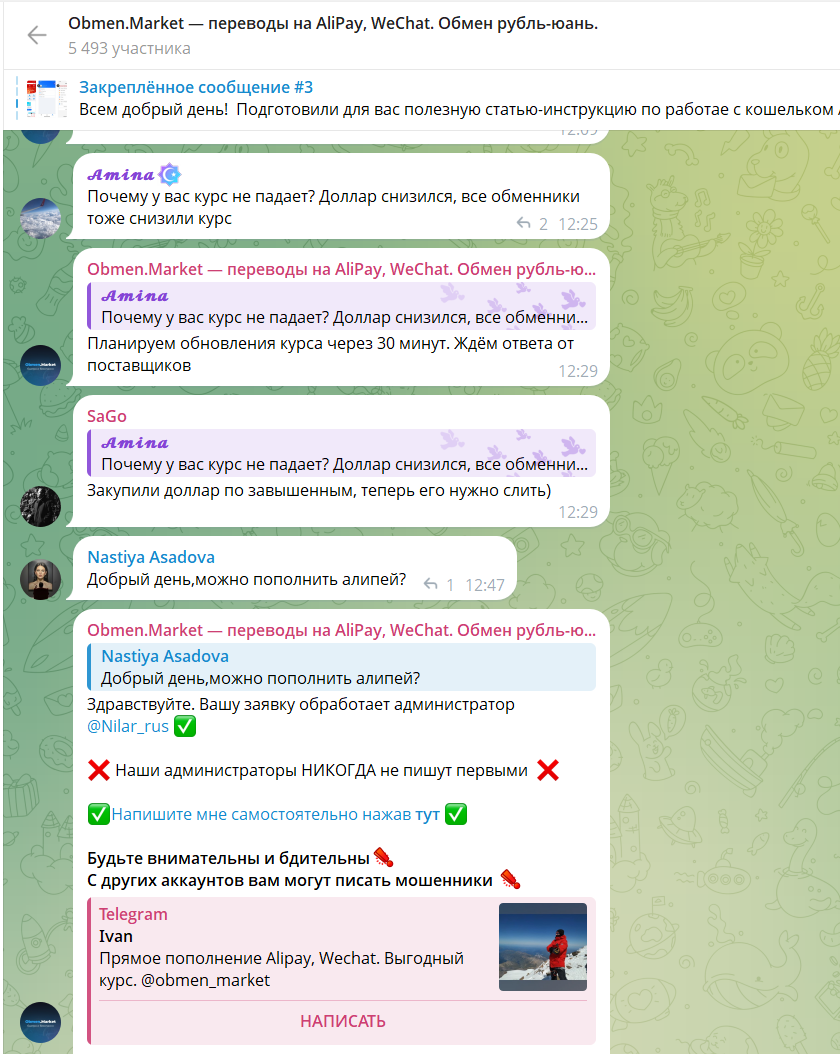 В ТГ-канале организации Obmen market можно посмотреть актуальный курс юаней, по которому проходит обмен. В сообществе 5493 человека, сколько из них просматривают посты, проверить не удалось. Также осенью 2024 года в группе были закрыты комментарии, якобы из-за мошенников, которые прикидываются администраторами проекта.
