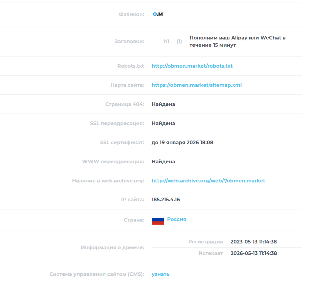Домен компании Obmenmarket, как и некоторые ее соцсети, зарегистрирован в 2023 году. Возможно, до этого использовались другие площадки и инструменты.