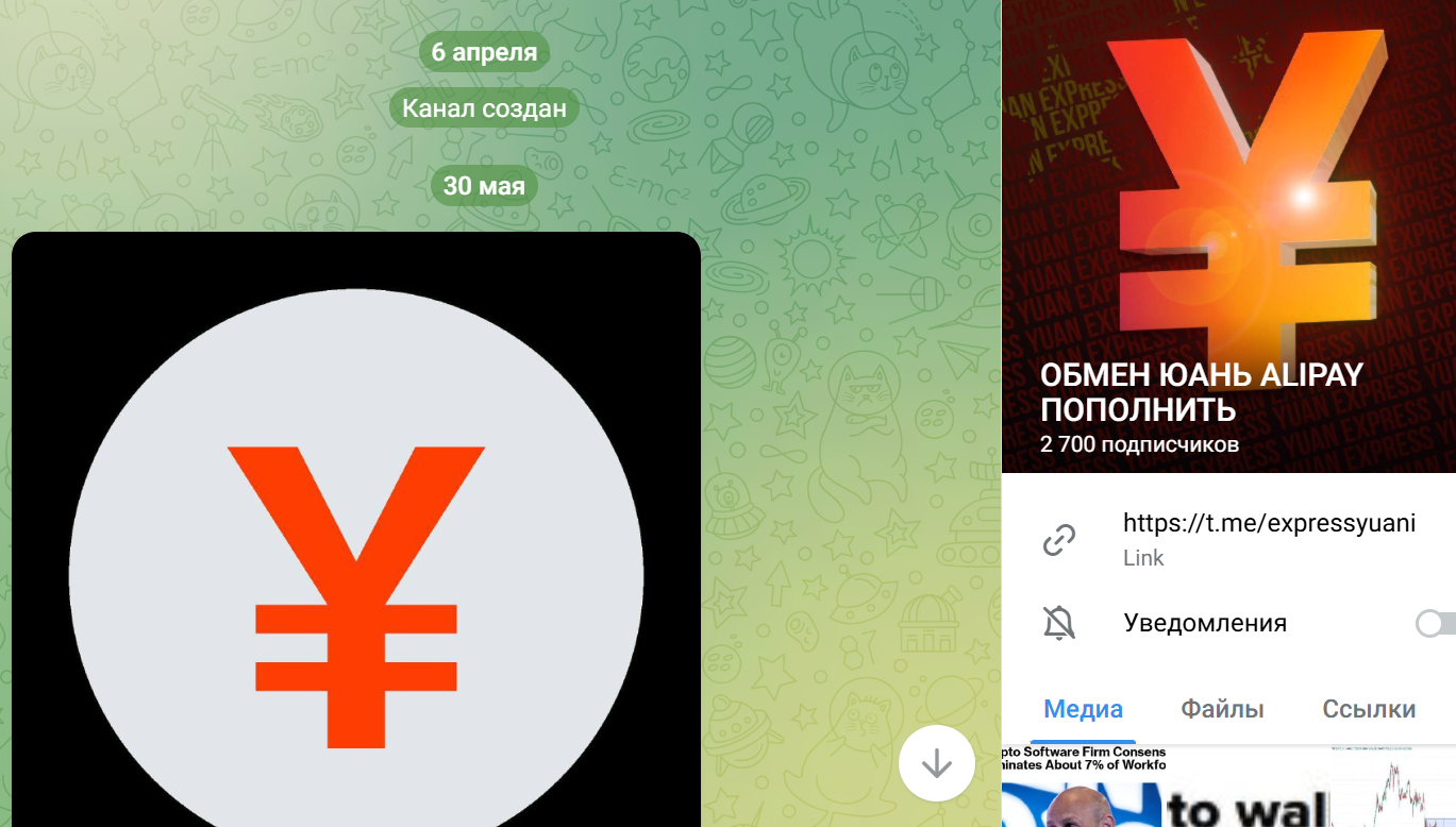 Obmennik911, или как называется канал на момент обзора ОБМЕН ЮАНЬ ALIPAY ПОПОЛНИТЬ – сообщество на базе Telegram, ведущий которого предлагает услуги по обмену крипты и пополнению китайских платежных систем и банковских карт. Так пользователь может воспользоваться офферами посредника для пополнения сервисов Alipay или WeChat. Наша редакция внимательно изучила проект – расскажем все детали далее в статье.
