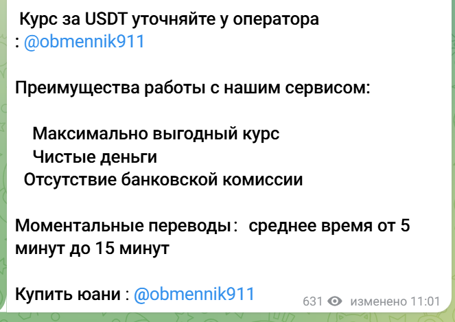 Все сделки проходят через личную переписку с менеджером Ксенией, Телеграмм профиль – @ obmennik911. Учитывая опыт работы аналогичных каналов, личность Ксении, скорее всего, подставная.