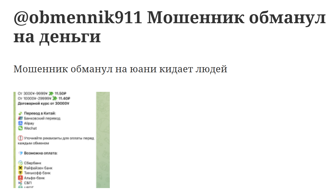 Если вы знаете другие ресурсы данных обманщиков или владеете дополнительными деталями о схеме развода от проекта ОБМЕН ЮАНЬ ALIPAY ПОПОЛНИТЬ, обязательно укажите в комментариях и помогите предупредить других об обмане.