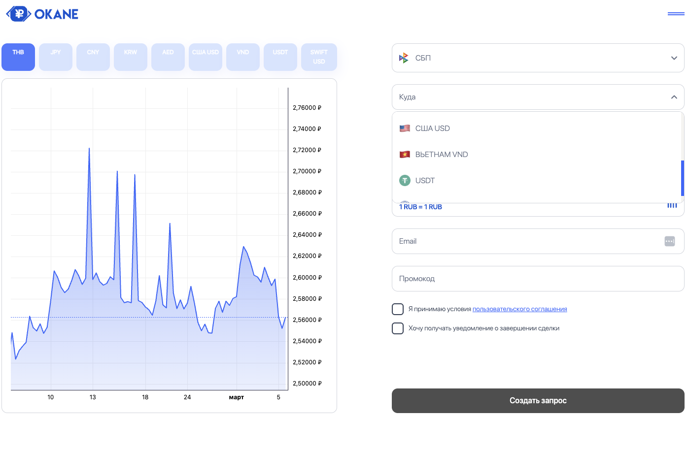 Okanetransfer Com — сервис для совершения переводов денег из России за границу. Поддерживает SWIFT USD, USDT, а также трансфер в пункты выдачи, которые расположены в азиатских странах: Таиланде, Вьетнаме, Японии и др.