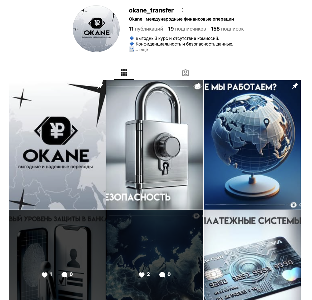 На страницу okane transfer в Instagram, на 8 марта 2026-го года, подписаны 19 пользователей. Изображения для публикаций сгенерированы при помощи нейросетей, причем сделано это не очень умело. Посты почти не получают взаимодействий.