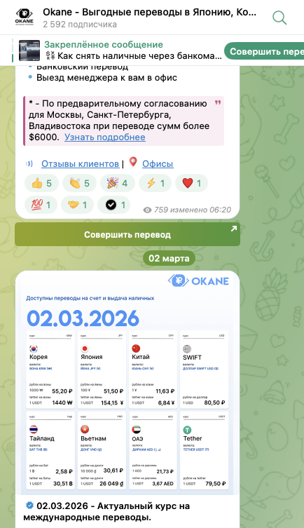 На телеграмм-канал «Okane Выгодные переводы», располагающийся по адресу okane transfer, на 8 марта 2026-го года подписаны 2,6 тысяч пользователей.