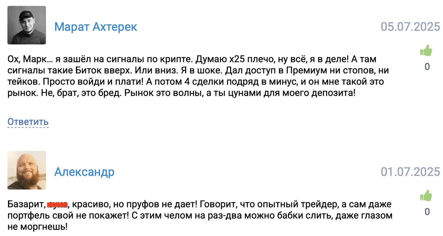 Канал Okoinvesting нигде не упоминается, зато про «Рискованного Марка» говорят много и красочно. На профильных форумах нами найдены десятки негативных отзывов на мошенника. Бывшие клиенты жалуются на слитые депозиты, вымогательство, отсутствие обратной связи.