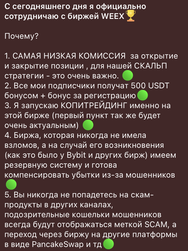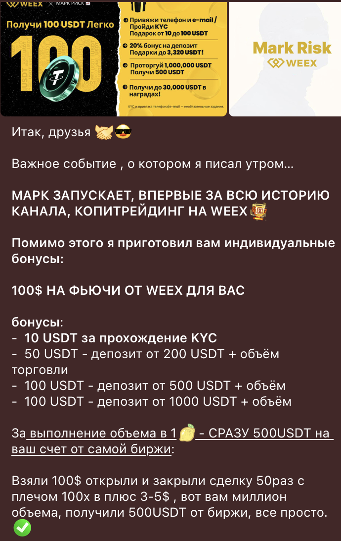 Также в сообществе постоянно продвигаются сомнительные трейдерские биржи. Например, админ открыто рекламирует платформу Weex и не скрывает факт сотрудничества с ней. Он публикует реферальные ссылки и зарабатывает процент с каждого привлеченного трейдера и слитого им депозита.