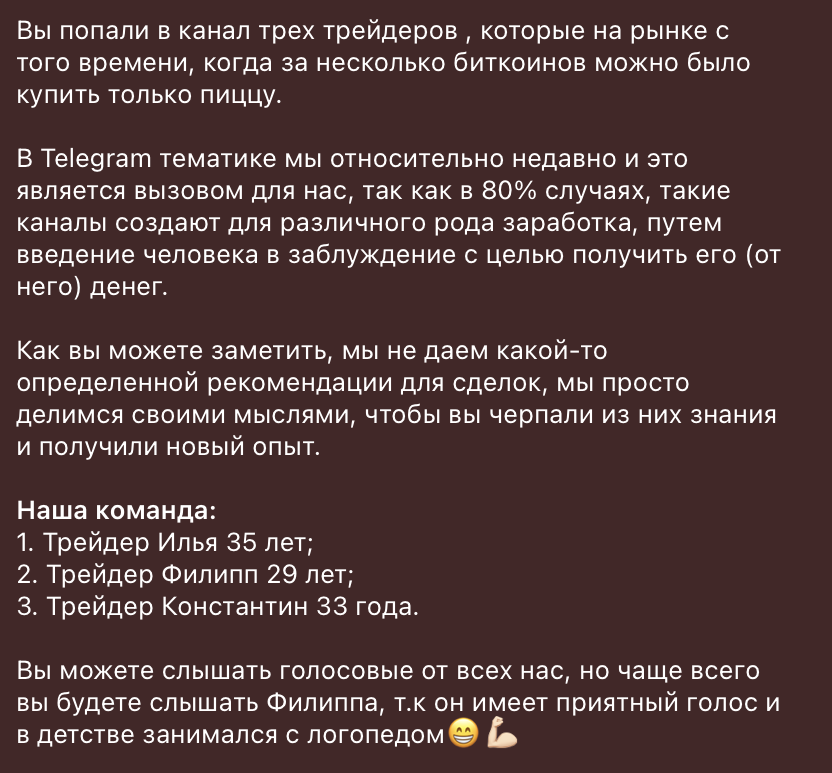 Oko Investing позиционирует себя как сообщество «трех трейдеров» — Ильи, Филиппа и Константина. Кроме имен никакой информации они не раскрывают, что уже ничего хорошего не сулит. В приветственном обращении они гордо утверждают, что честны с подписчиками и не собираются водить их за нос ради денег. Якобы данный канал — совершенно бесплатный источник полезной информации.
