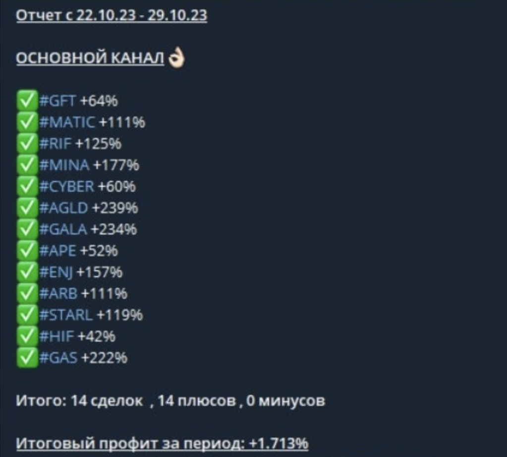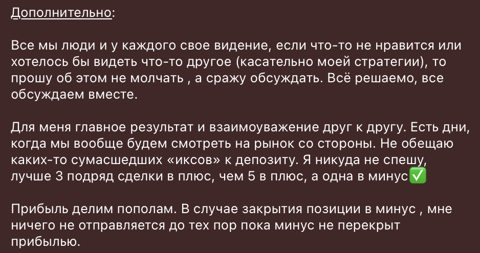 На телеграм-канале «Марка» (он же мистер Око) все куда конкретнее: в ленте публикуются сигналы с условием разделения прибыли 50 на 50. На фоне отсутствия подтвержденной статистики по сделкам и высокой волатильности стратегий такие условия слишком рискованны для инвестора.