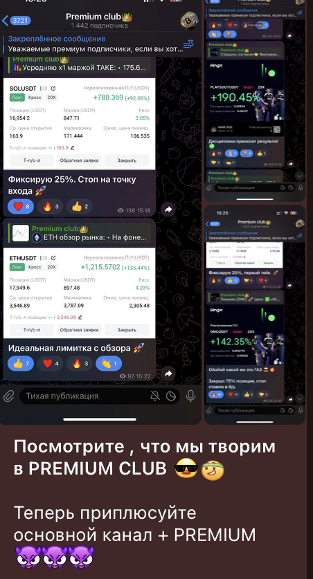 Контент его сообщества представлен бесплатными сигналами, но без точек входа, «стопов» и других важных атрибутов трейдинга. Вместо этого админ настойчиво рекламирует платный доступ в «премиальный» клуб. Цена вопроса — от $129 в месяц до $1249 за бессрочное членство в клубе.
