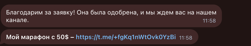 Кажется, что перед нами обычный канал с торговыми сигналами и аналитикой рынка форекс или криптовалюты. Однако при внимательном изучении бота сообщества мы заметили ссылку, приглашающую нас в некий «марафон с $50».