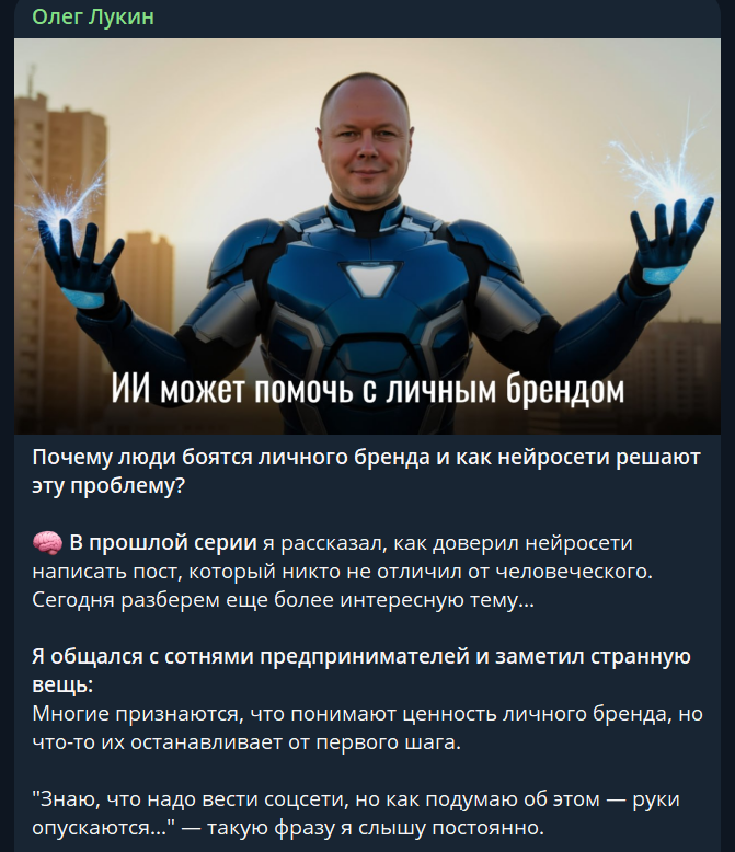 Дополнительно на канале выкладываются публикации о развитии, интересные истории из жизни, цитаты знаменитых людей и другие посты на отвлеченные темы. В последнее время. Автор пишет о заработке с помощью ИИ. В новом проекте он опять получает стабильную прибыль, не прилагая больших усилий. Помимо заработка крипты, Олег Лукин с помощью нейросетей продвигает свой личный бренд и создает контент. Он готов помочь подписчикам со скриптами и другими особенностями работы системы. Также он предлагает присоединяться к новым проектам, которые продвигает.