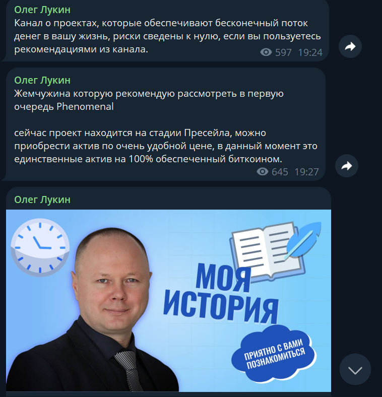 В постах своего ТГК трейдер Олег Лукин буквально с первых сообщений начинает рекомендовать Phenomenal на стадии предпродаж. Реклама его была в публикациях канала еще в 2020 году. Проект должен был стать очень перспективным для заработка, но в итоге оказался пустым. На тот момент его продвигали различные трейдеры. Автор площадки говорил о сведении рисков к нулю, но практика показывает совершенно иные результаты, так как вкладчики потеряли свои деньги.