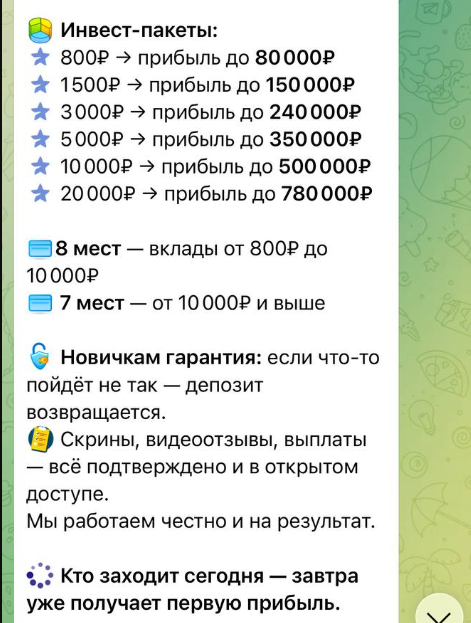 Так что, сохраняйте здравый смысл: если вам предлагают кнопку «бабло» и гарантируют сотни процентов профита с одной тысячи рублей, значит, вас пытаются обмануть. Лучшее решение – не вступать в диалог, не переводить ни копейки, заблокировать автора и кинуть в ТГ жалобу на этот канал.