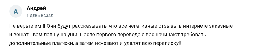 Зато юзеры в сети говорят совсем о другом. Бывшие подписчики жалуются, что после перевода депозита общение переходит в фазу вымогательства. Жертве показывают картинку с прибылью, но деньги почему-то не переводят, все происходит как раз наоборот – начинаются требования оплатить «налог» (обычно 13% от вымышленной прибыли) или комиссию за вывод. Как только доверчивый вкладчик переводит нужную сумму, его блокируют и удаляют всю переписку.