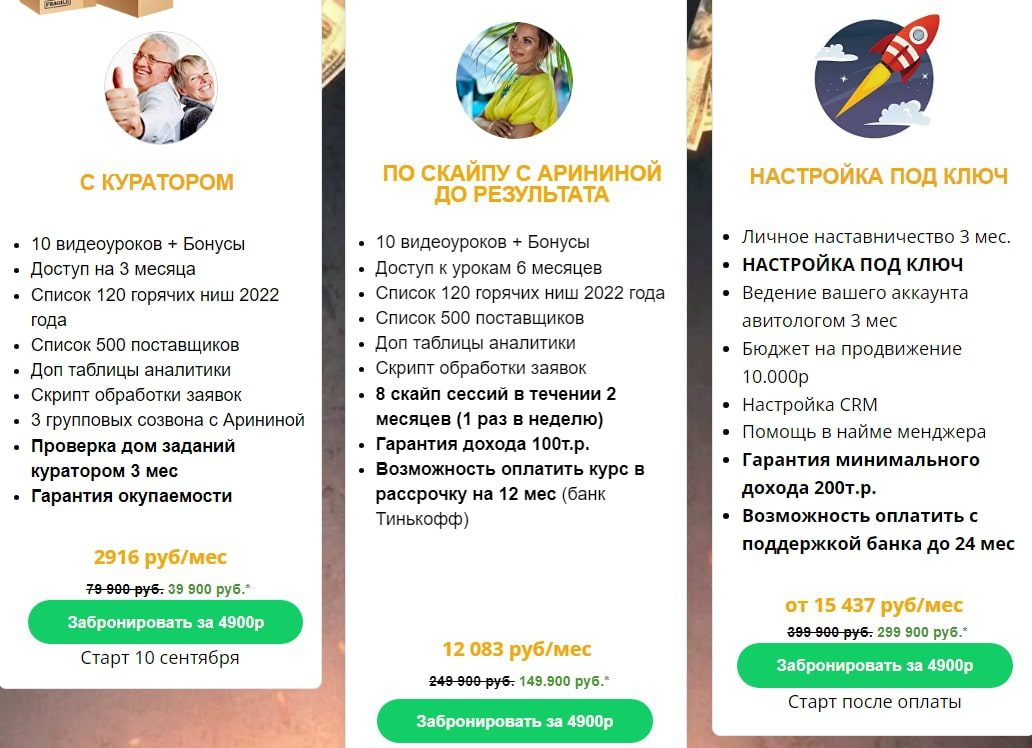 На момент написания обзора единственный курс, который предлагала Ольга Аринина — это Денежное место. Обучающая программа была доступна в трех тарифах. В зависимости от формата обучения стоимость составляет:
