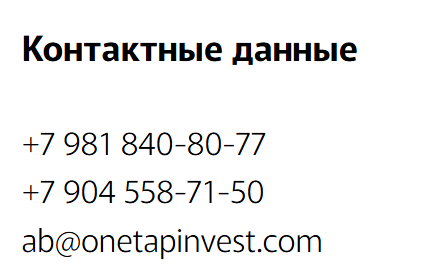Связь с технической поддержкой доступна через специальную форму. Также клиентам предлагается два телефона — +7-981-840-80-77 и +7-904-558-71-50. Дополнительно представлен электронный ящик ab onetapinvest com.