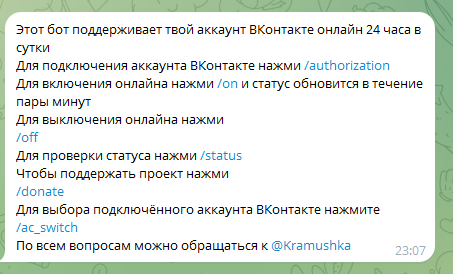 Пользователь может подключить аккаунт в ВК для того, чтобы статус онлайн в нем отражался 24 часа в сутки. В боте пре