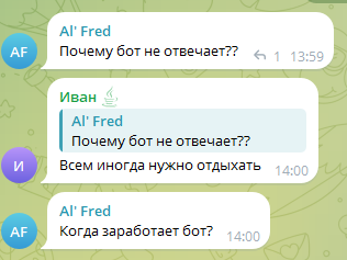 Суть бота заключается в том, что он позволяет обеспечить круглосуточный онлайн в ВК. Мы не нашли причин, по которым это могло бы пригодиться, но тем не менее бот существует и, возможно, кем-то используется. На чат бота подписано почти 700 пользователей. Активность в чате не такая большая. Часто сообщения пользователей не выходят по нескольку дней.