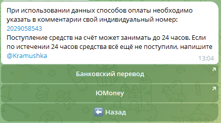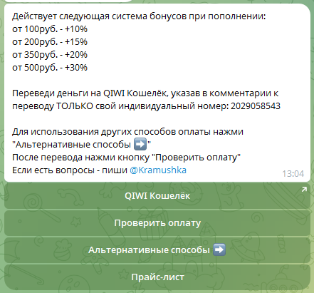 Оплата на баланс бота проводится через КИВИ кошелек.