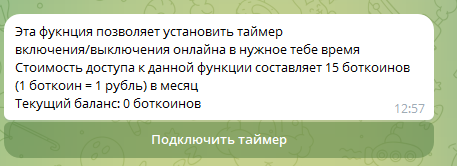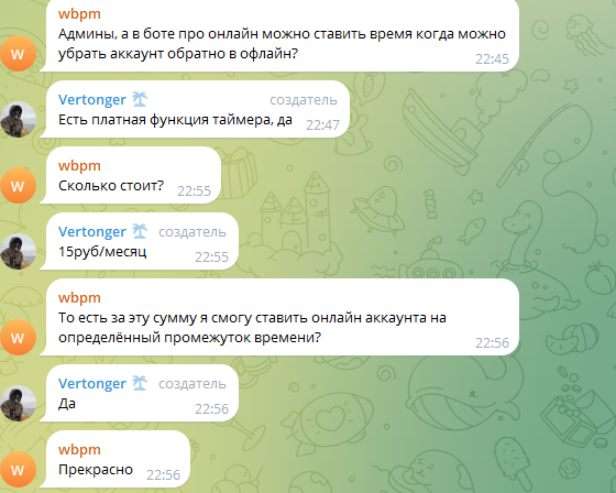 Помимо бесплатных услуг пользователь может заплатить за дополнительные функции бота. Например, можно включить таймер включения/выключения онлайна. Эта услуга стоит 15 рублей в месяц для одного аккаунта.