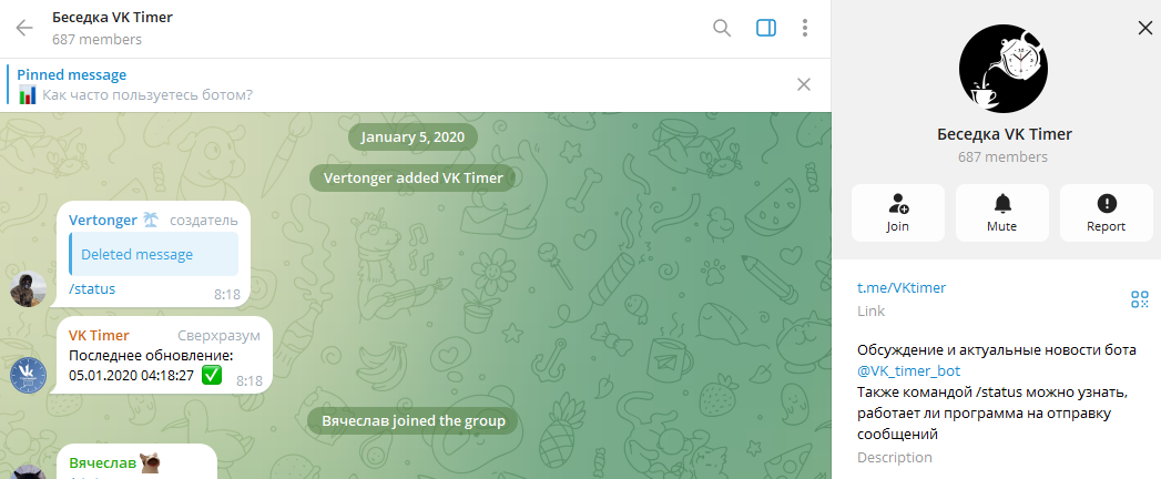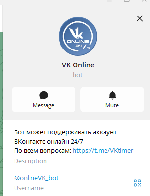 Странно, что в самом боте указан аккаунт другого пользователя для связи, но он ссылается на чат именно ВК Таймер: