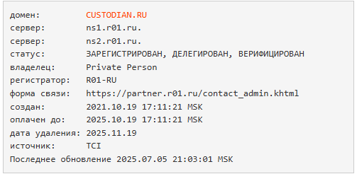 Мы проверил домен custodian ru. Результат плохой и поднимает много вопросов о честности компании. Сайт создали меньше четырех лет назад. Это идет против заявлений о 10-летнем опыте работы. Как можно работать десять лет, если твой главный сайт живет всего четыре года. Есть только две причины для смены домена. Либо компания полностью поменяла название и направление работы. Либо старый домен попал в проблемы. Например, его заблокировали за мошенничество.