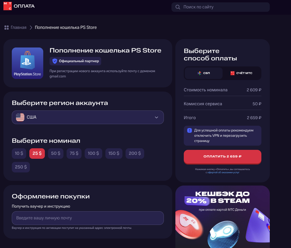 Даже условно дорогостоящее решение – пополнение кошелька через МТС выглядит не таким дорогим. За 2659 рублей можно купить 25 баксов на аккаунт.
