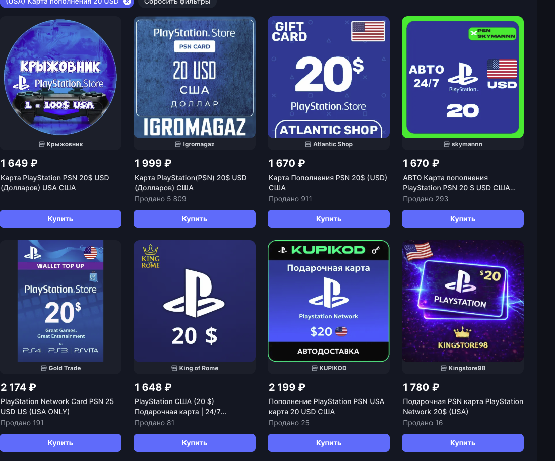 При этом есть целый ряд аналогичных сервисов, на котором такие услуги оказываются в разы дешевле. Для примера можно взять популярную платформу Плати Маркет. Через нее можно купить карту пополнения на 20 баксов по цене около 1.7 тысячи рублей.