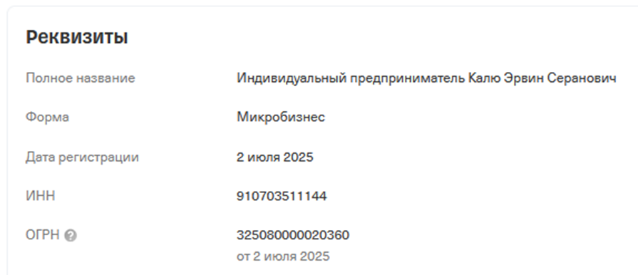 Платежная система Oplata Best заявляет об официальной регистрации. На сайте можно найти реквизиты ИП Калю Эрвина Серановича, который указан в качестве владельца бизнеса (ИНН 910703511144). Информация о регистрации от 2 июля 2025 года подтверждается.