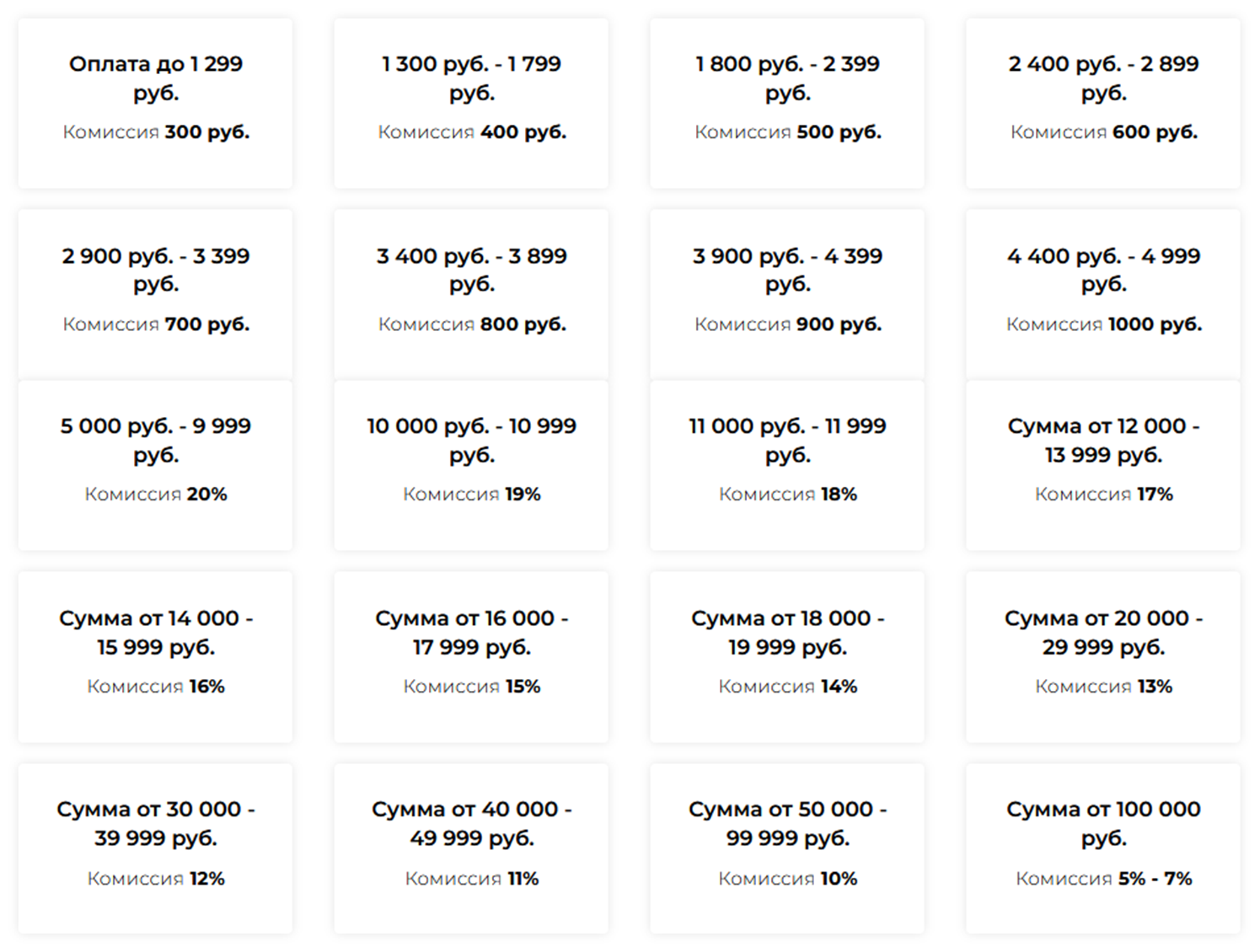 Комиссионные системы указаны на сайте. Для транзакций до 4399 рублей сервисный сбор составляет 300-900 рублей. Для переводов 5000-99999 рублей ставка равна 20-5%. При увеличении суммы комиссия снижается.
