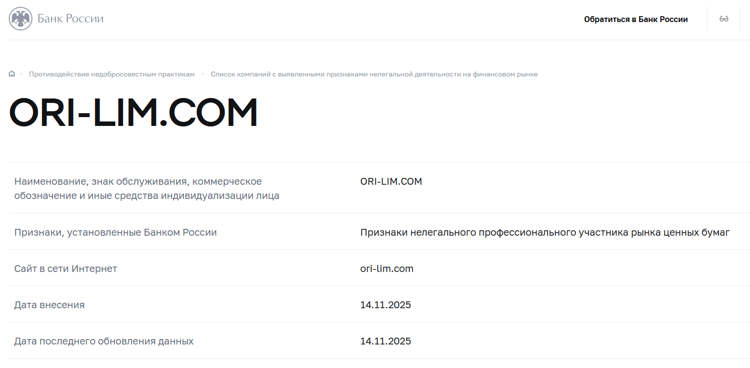 Первым делом важно отметить, что сайт Ори Лим Ком был открыт через зарубежного регистратора только 18 сентября 2025 года, то есть брокер молодой независимо от заявлений создателей.