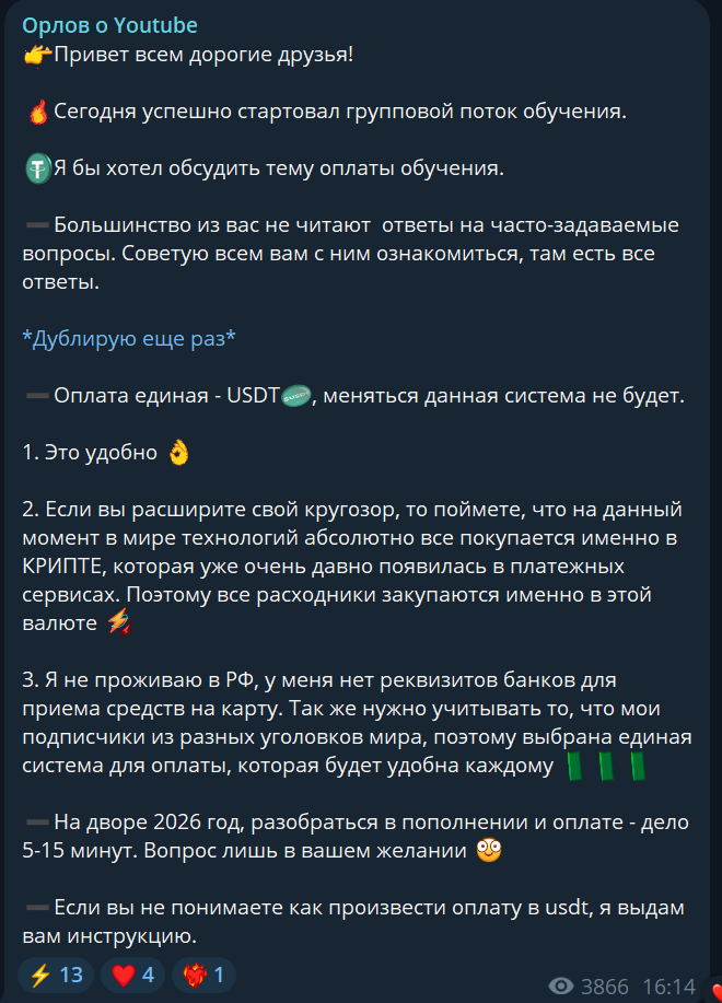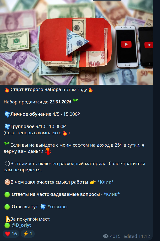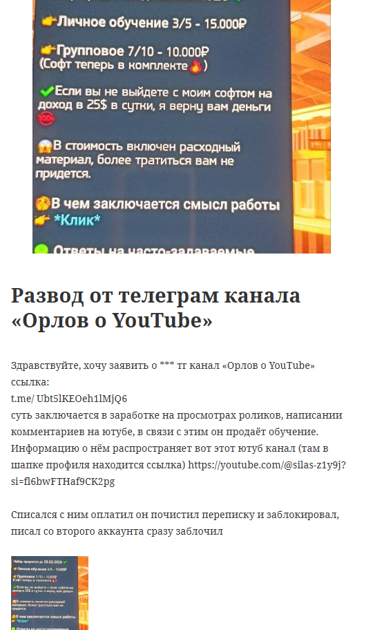 Этот так называемый проект «Орлов о YouTube» — очередная ловушка для доверчивых людей. Автор, скрывающийся под ником D orlyt, обещает золотые горы за выполнение простейших заданий на YouTube, но на деле это пустые слова. Он требует оплату в USDT, ссылаясь на проживание за границей, что уже вызывает подозрения. После перевода денег никакой поддержки или материалов вы не получите — только блокировку и удаление переписки. Гарантии возврата средств — фикция, а стоимость обучения и софта завышена в разы. Не дайте себя обмануть этому мошеннику!