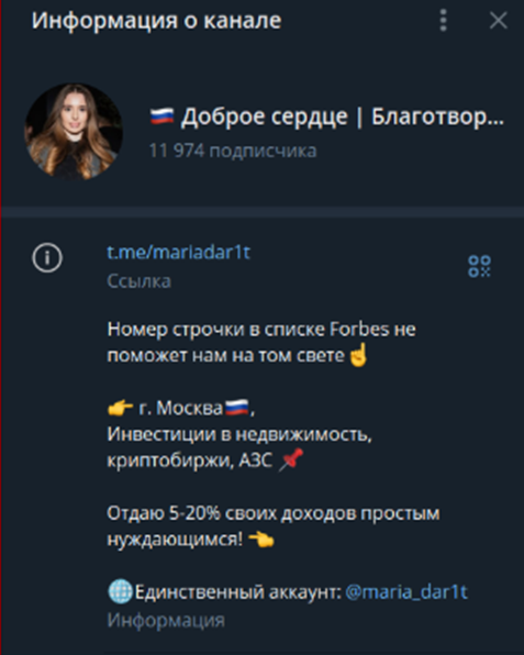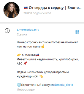 «От сердца к сердцу» – канал, в котором можно выиграть 200 000 рублей просто за подписку. Его владелица – девушка по имени Мария, которая занимается инвестициями в крипту и АЗС. Наша героиня считает, что нужно делать добро и обязательно отдавать часть от своего дохода. Но стоит ли ей верить или перед нами очередная мошенница – читайте в новом обзоре.