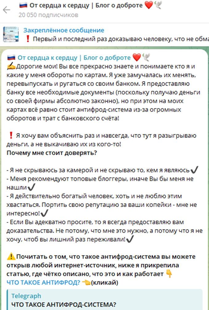 Канал «От сердца к сердцу» и подобные ему аккаунты – скам. Никто не проводит подобные раздачи, их цель – выманить деньги у пользователей, прикрываясь различными предлогами. Подобные проекты имеют следующие признаки: