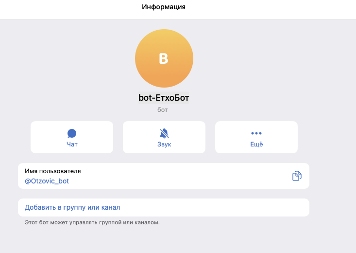 Бот носит название bot-ЕтхоБот. В марте 2026 года он не реагирует ни на какие команды пользователя.
